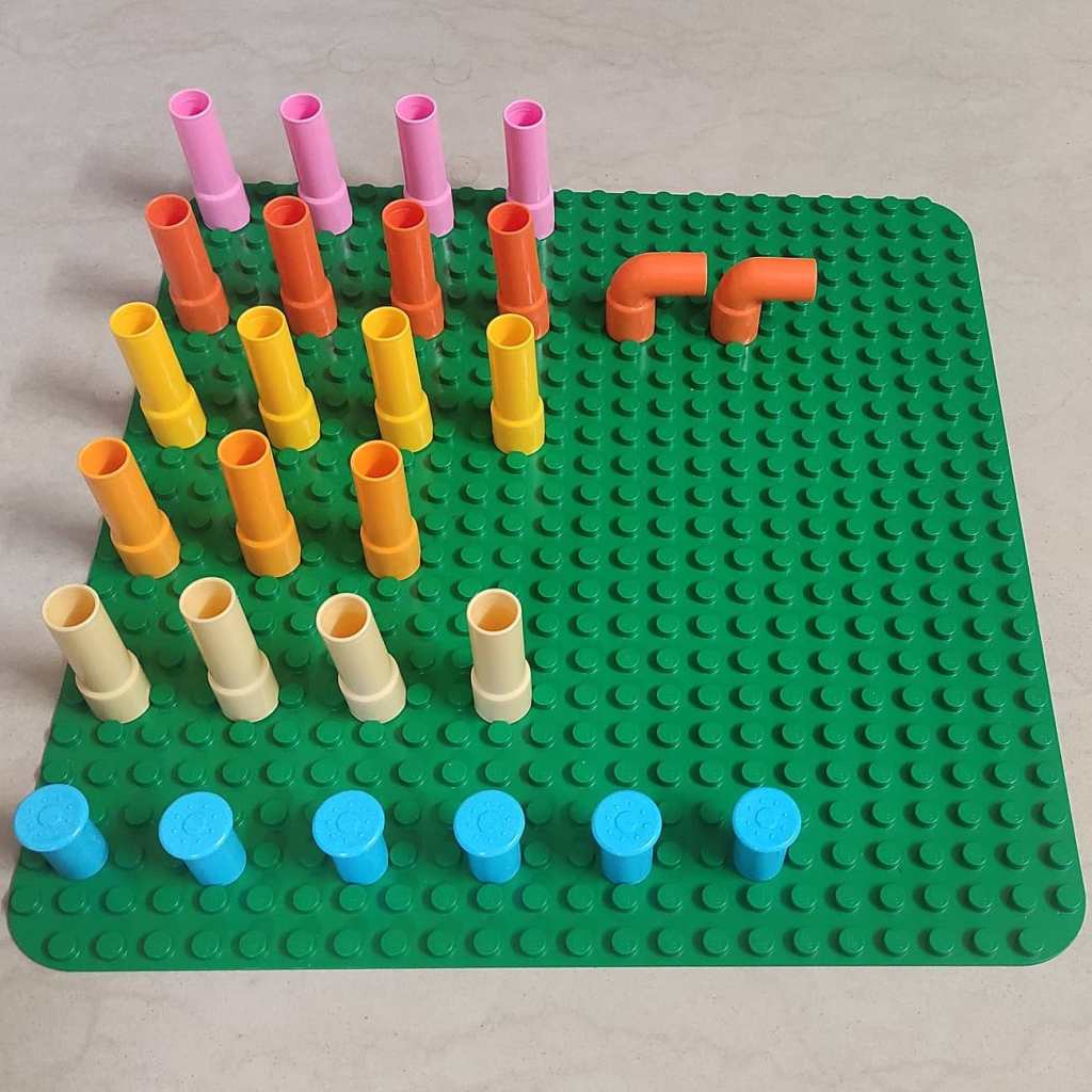 The process involved colour sorting, counting, balancing the lego plate and arranging the pipes at the interval of two green points / pegs / dots each. The pipes are a bit loose on the base plate so they did fell at times and she managed to place them again. The best part was that she carefully lifted and balanced the entire creation ![]()