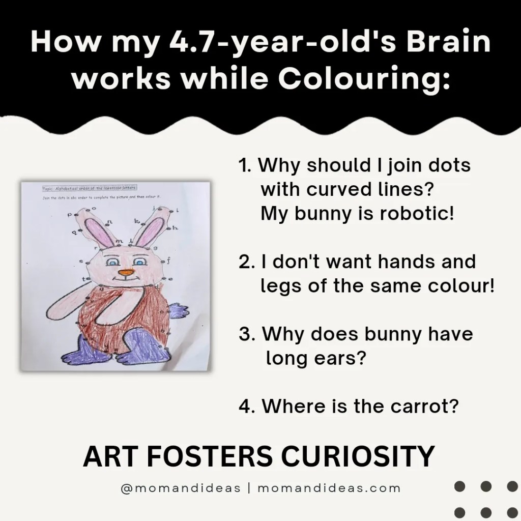 Check the image to see how many questions she had (and some more) while colouring this bunny today! Art fosters curiosity and opens the doors to imagination and creativity!